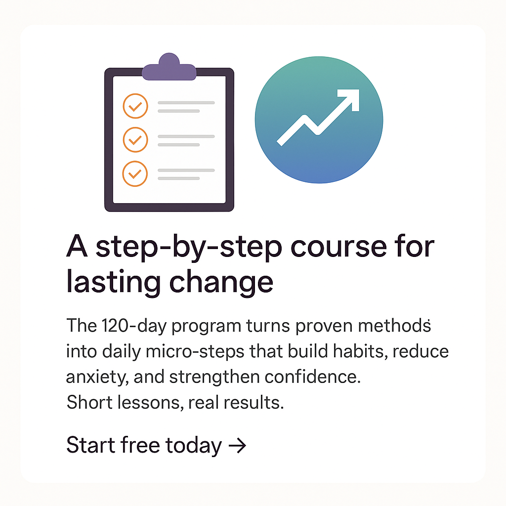 This course and its accompanying tools are for educational and self-improvement purposes only. They are not intended to diagnose, treat, cure, or prevent any mental health condition. Participation in this program does not create a therapist–client relationship, and the content provided should not be considered a substitute for professional therapy, counseling, medical treatment, or advice.