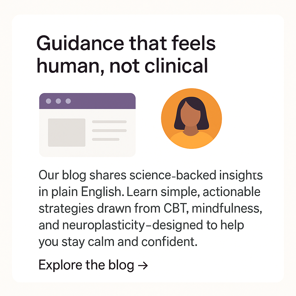 Short, focused modules grounded in cognitive & behavioral psychology. In ~10 minutes a day, you’ll start to interrupt rumination, self-criticism, and stress loops.